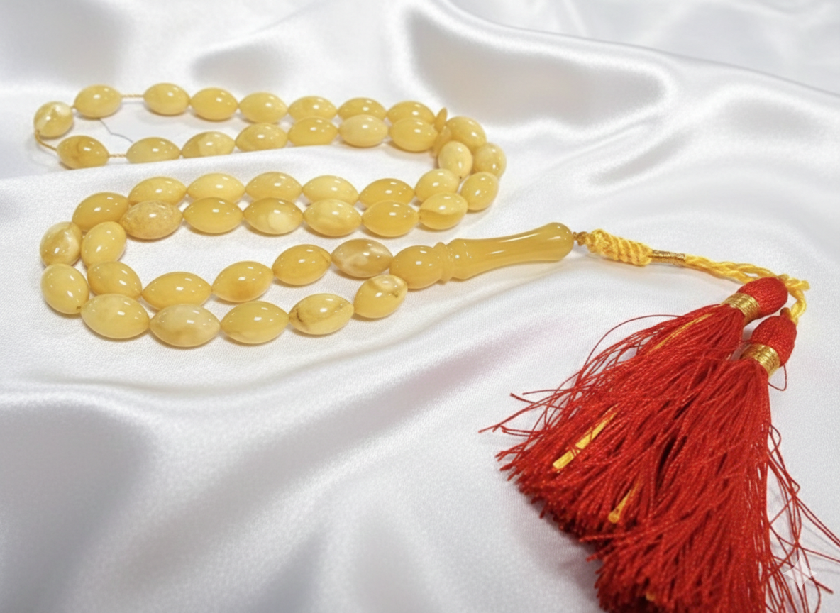 - اللون الكهرماني الأصفر الزيتوني يعطي مظهرًا طبيعيًا فريدًا وجاذبية أنيقة للسبحة