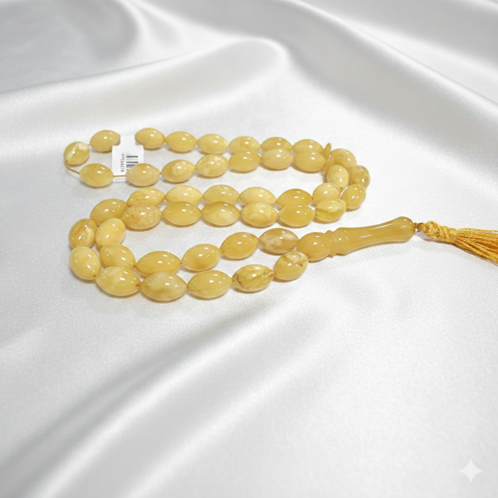 سبحة موديل A18 باللون الكهرماني الأصفر الزيتوني تمنح إحساسًا دافئًا وفاخرًا عند الاستخدام اليومي.