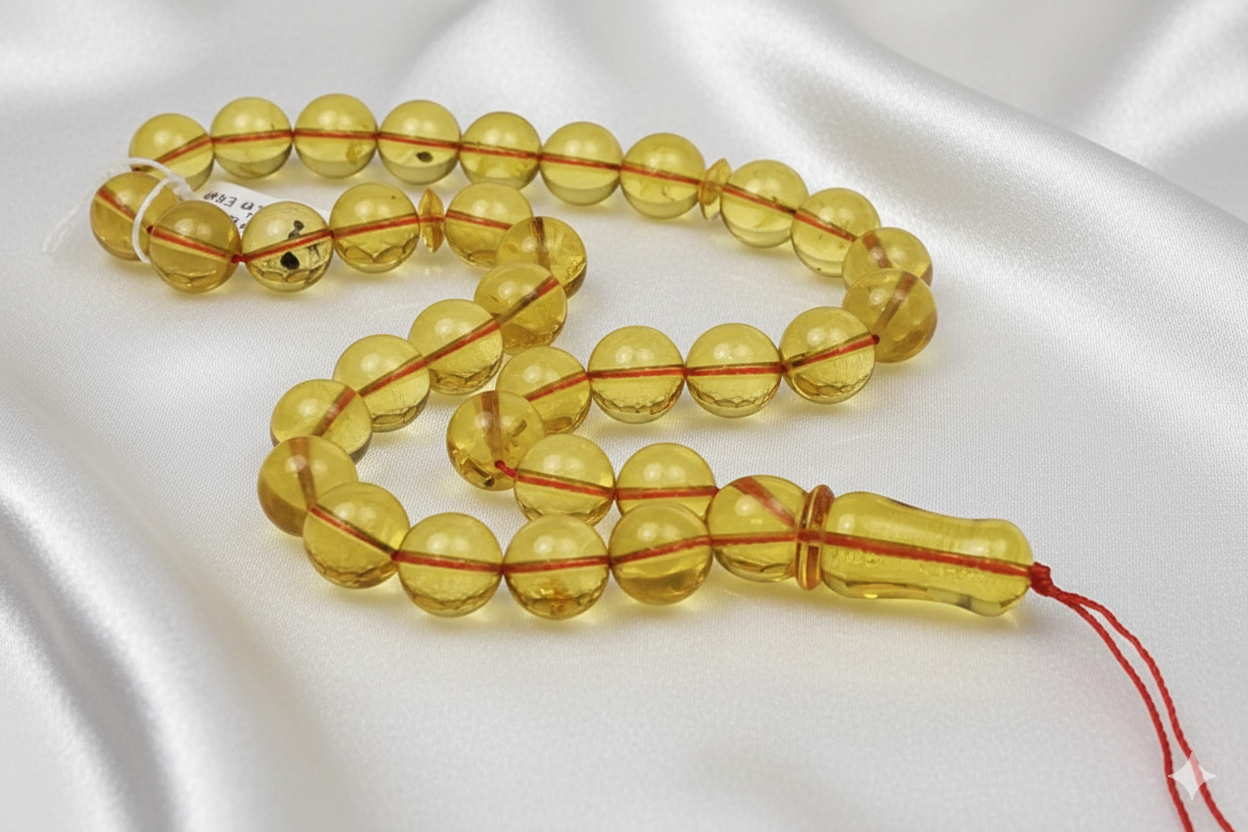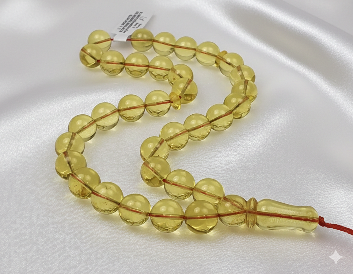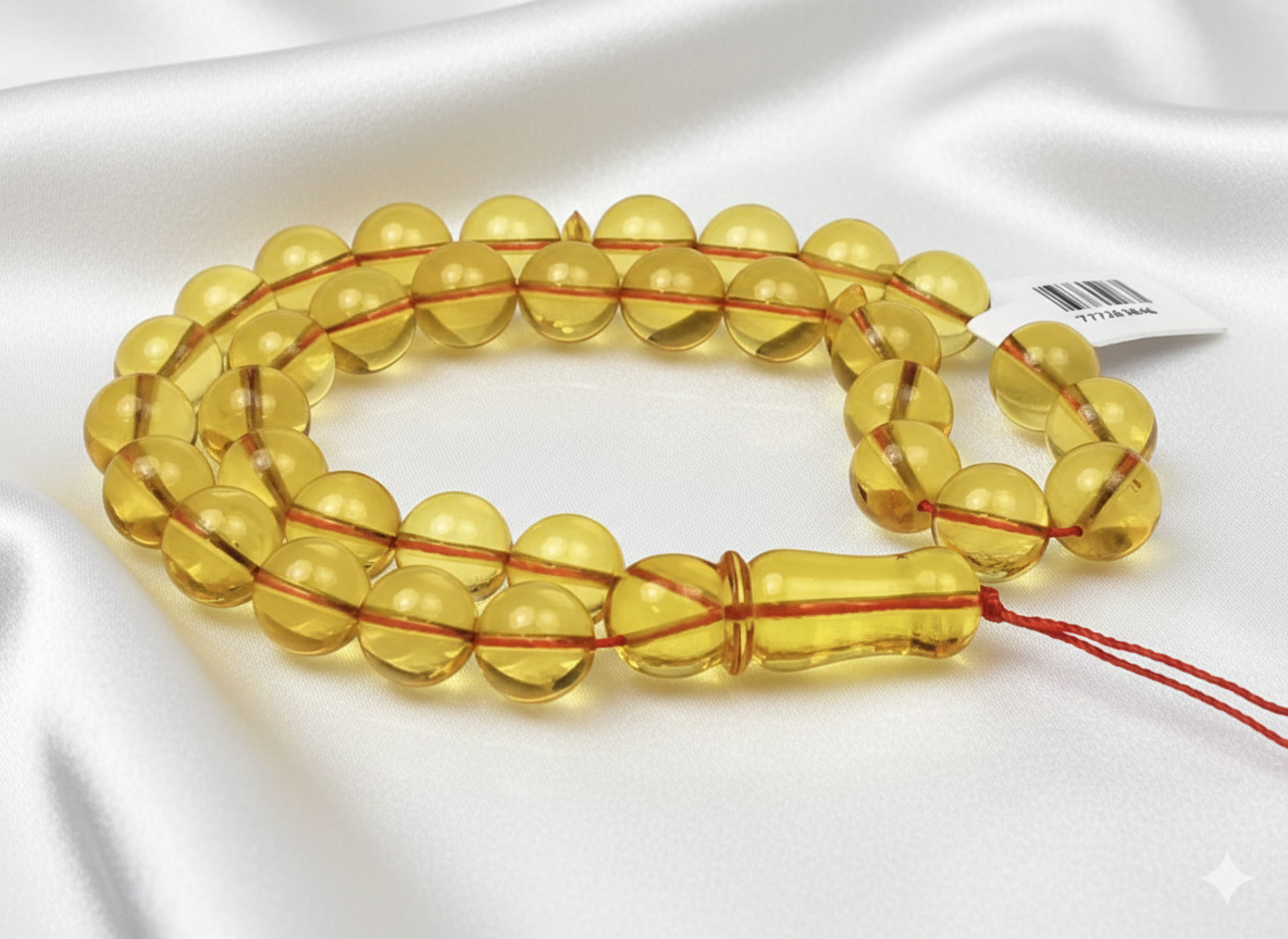 مسبحة موديل A09 تمنح تجربة صلاة هادئة ومريحة بفضل خرزها الكهرماني الشفاف. تصميمها الدائري يضفي أناقة وروحانية على كل تسبيح.
