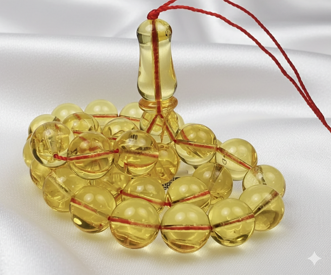 • خرز كهرماني شفاف عالي الجودة يعكس الضوء ويضفي لمسة فاخرة